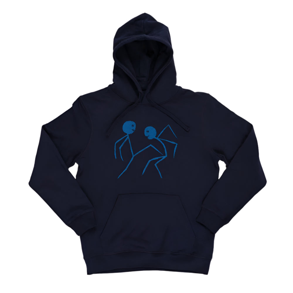 Navy pullover hoodie with 'Kicking' design printed on the front.