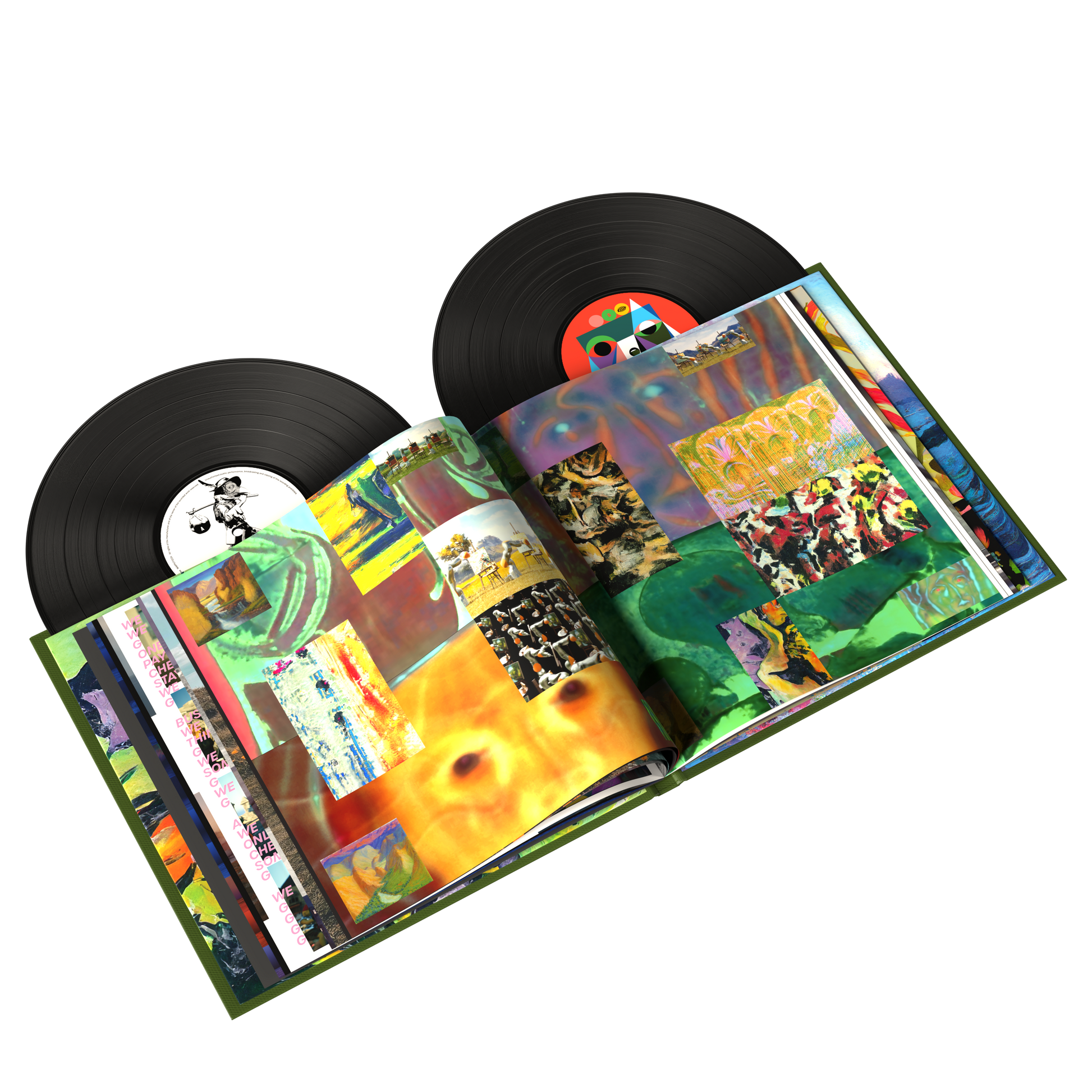 Black 2LP vinyl in polylined paper inners, housed in casebound sleeve with printed sleeves held in front and back cover, 36 page suspended booklet, debossed cover with tipped in central image